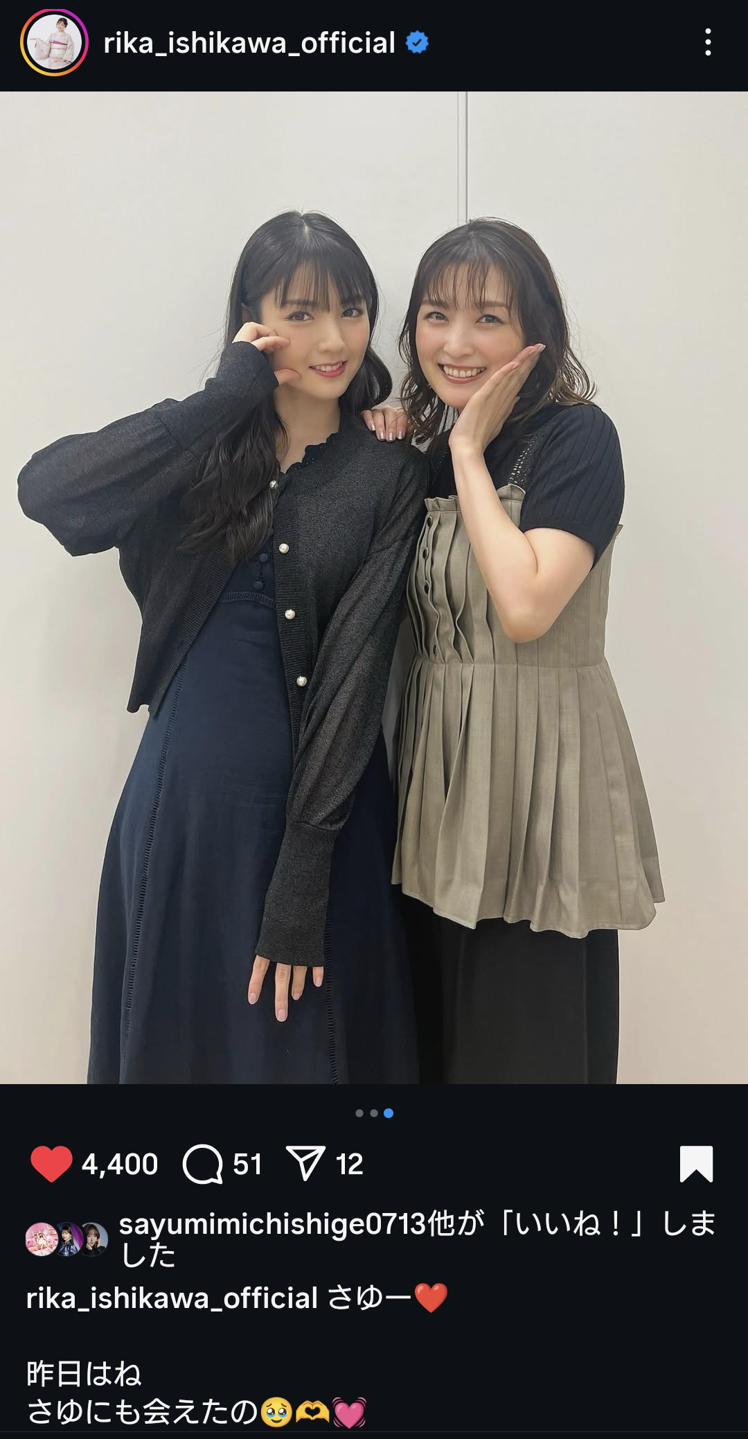| 「どうしてもエコモニ。ポーズで写真撮りたくて」元「モー娘。」石川梨華、ツーショット披露 …る元「モーニング娘。」・道重さゆみとのツーショットを投稿。「どうしてもエコモニ。ポーズで写真撮りたくてリクエストしちゃった 色々話せて嬉しかった」とス… (出典:スポーツ報知) |