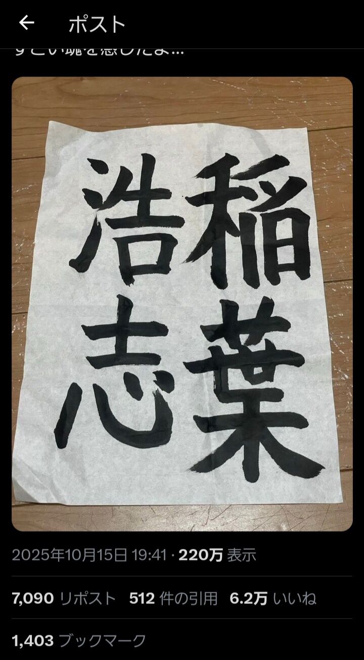 さわやか五郎 @sawayakagoro 小四の娘が今日の書道で『好きな漢字四文字を書く』と言う課題で書いてきた作品。 すごい魂を感じたよ… 午後7:41 · 2025年10月15日 https://x.com/sawayakagoro/status/1978410784288829645