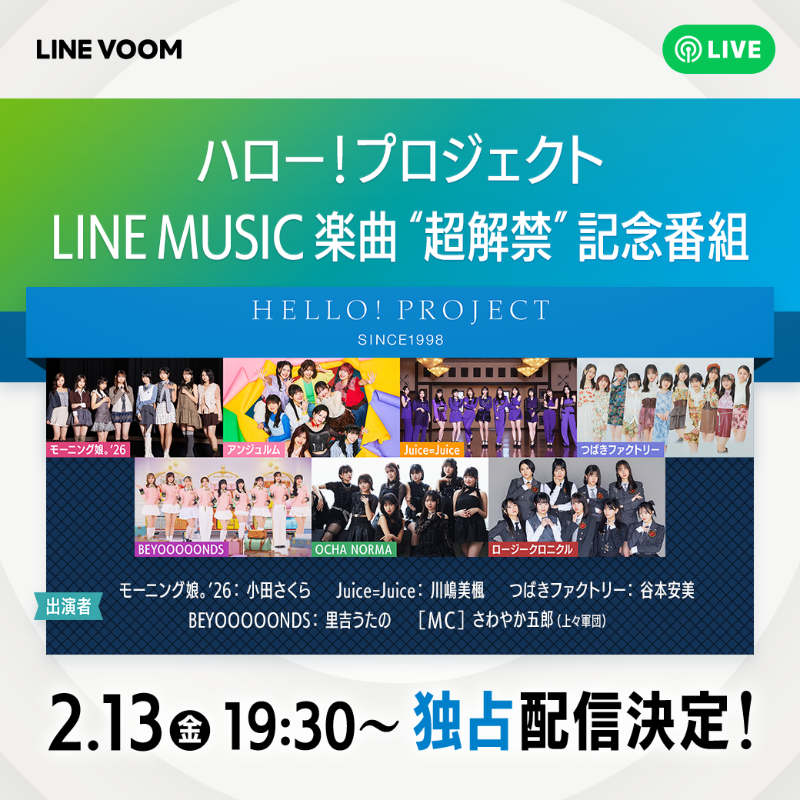 LINE VOOM @LINEVOOM_Japan /⋰ LINE VOOM独占LIVE配信決定📢💕 ハロー!プロジェクト LINE MUSIC 楽曲"超解禁"記念番組 \⋱ 📅配信日 2/13(金)19:30~予定 ✨視聴はこちら✨ #ハロプロ #Helloproject 午後1:00 · 2026年2月12日 https://x.com/LINEVOOM_Japan/status/2021796403853582352