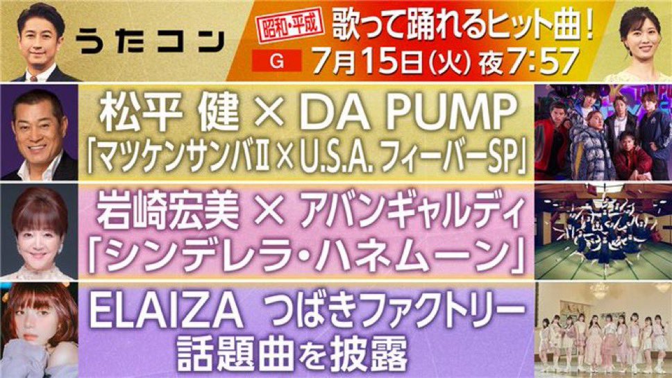 | 松平健とDA PUMPがSPコラボ 岩崎宏美がアバンギャルディと共演:うたコン …暑さも吹き飛ぶ、歌って踊れるヒット曲を特集する。 三山ひろしは、つばきファクトリーのダンスとともに西郷輝彦の「星のフラメンコ」を、倖田來未は山本リン… (出典:) |